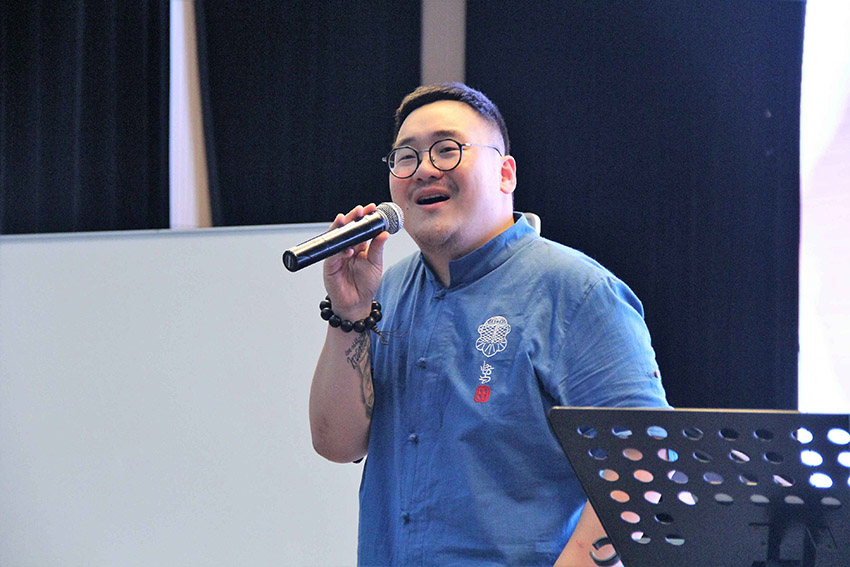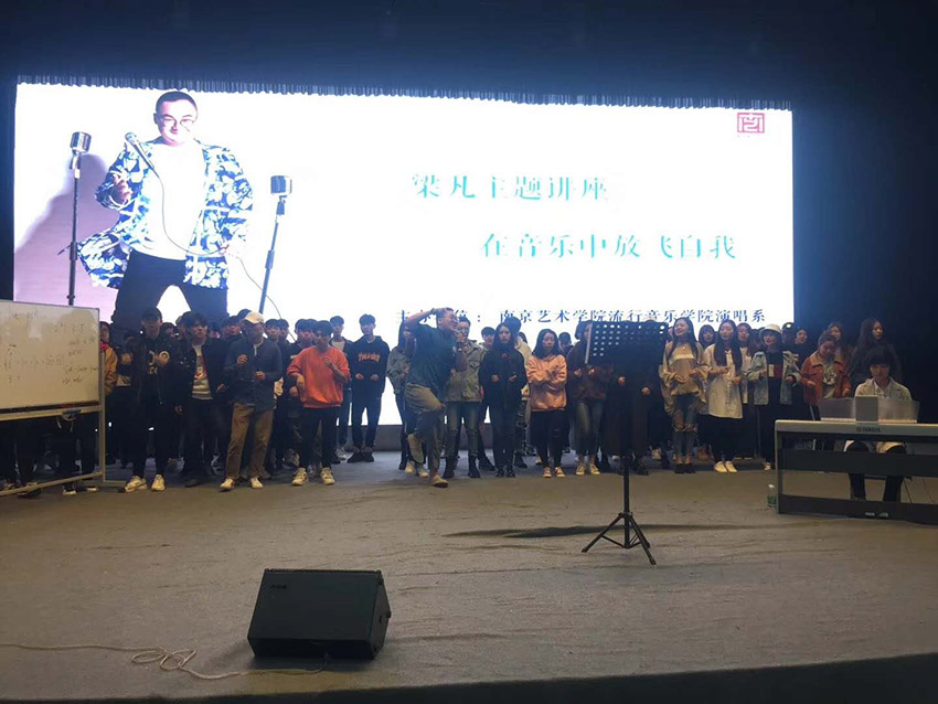 梁凡老师以一曲《what a wonderful word》用轻松愉快的freestyle拉开了本次讲座的序幕,围绕“自由”这个词展开,体现出“自由的歌唱,自由的律动”。讲座不同于以讲授为主的传统学术讲座形式,梁老师与在座的同学们积极互动,现场气氛非常积极活跃。他引导同学们在现场进行肢体舒展训练与爵士风格的练声,并邀请他们与自己一起即兴演唱和声音阶。现场互动过程中悠扬的和声,赢得了阵阵掌声。梁老师用“教授—练习—教授”的模式帮助在座的同学们获得启迪和成长——通过教授让同学们领悟律动方面的微妙知识,通过练习让大家在实践中不断体会琢磨提高演唱和创作的技巧。