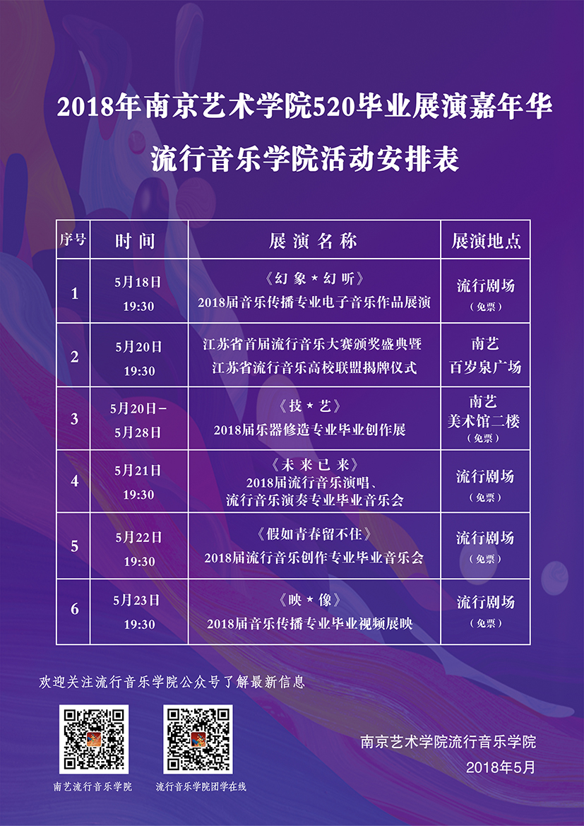 2、5月20日 19:30:江苏省首届流行音乐大赛颁奖盛典暨江苏省流行音乐高校联盟揭牌仪式——南艺百岁泉广场