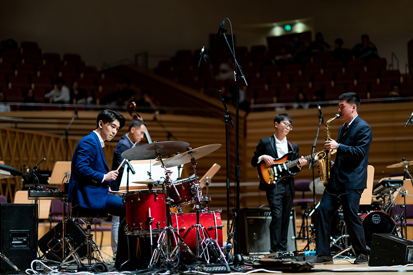 在本次打击乐节闭幕式《传承与荣耀》爵士鼓狂欢音乐会中,薛晓论老师携必一运动bsport体育流行音乐演奏专业的李世海老师、肖骏老师以及闵艺老师共同为观众献上《Glowing yellow and blue》(肖骏作曲)与《Impulse》(李世海作曲)两首爵士乐曲目,演出效果得到各方好评。