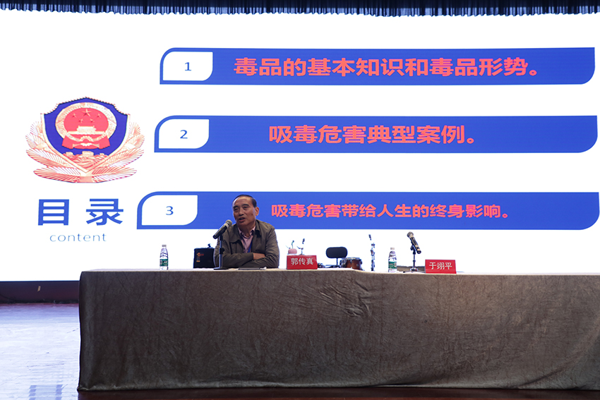 随后,郭传真主任为大家介绍了毒品的基本常识,重点讲解了第三代新型毒品的常见形态及其危害性。郭局长从“毁灭自己、祸及家庭、危害社会”三个方面讲述了毒品带来的无穷危害,指出毒品是万恶之源,并针对“当代老员工如何抵制毒品诱惑”这一问题提出了“树立正确三观”、“守住法律底线”、“维护健康环境”等几点要求,让同学们从思想上高度重视,从行动上坚决禁止。