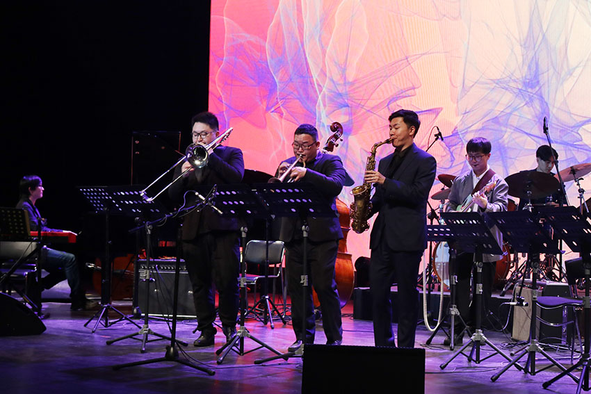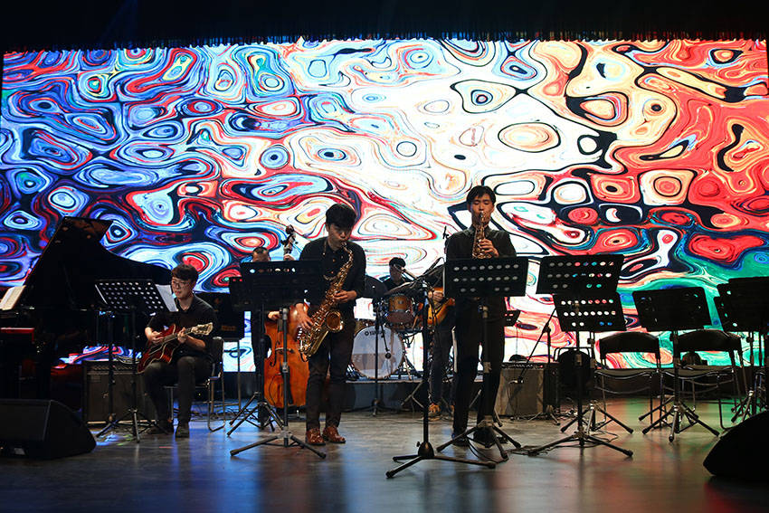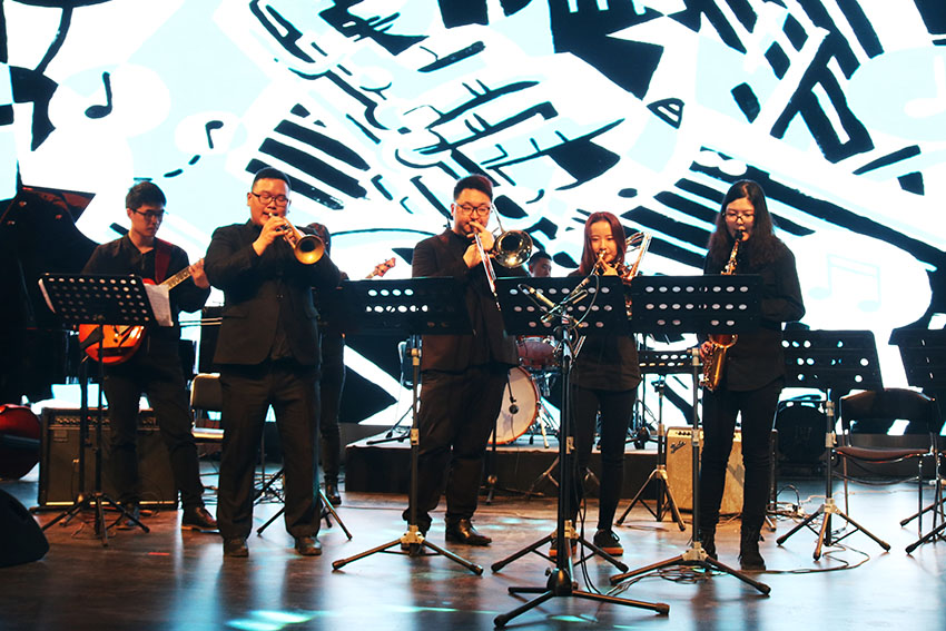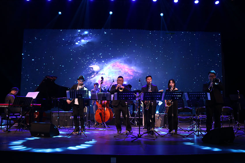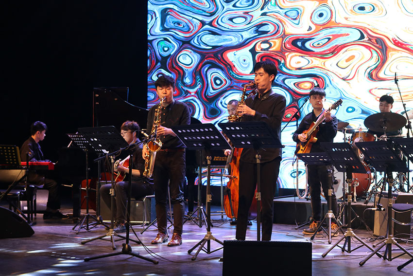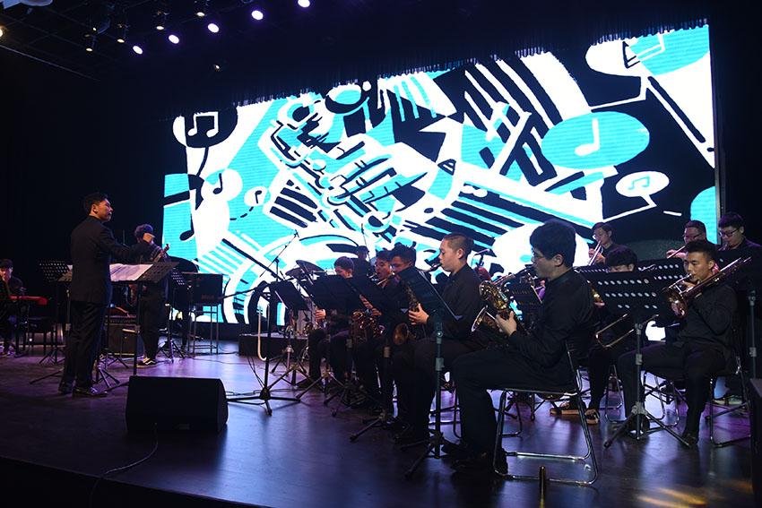 爵士乐中最具标志性的乐队编制形式和音乐类型当属爵士乐大乐团,流行音乐演奏系师生组成的爵士乐大乐团共同演绎的放克风格乐曲《What'sHip》和流行改编歌曲《月亮代表我的心》将音乐会气氛推向高潮,为此次活动划上了圆满的句号。