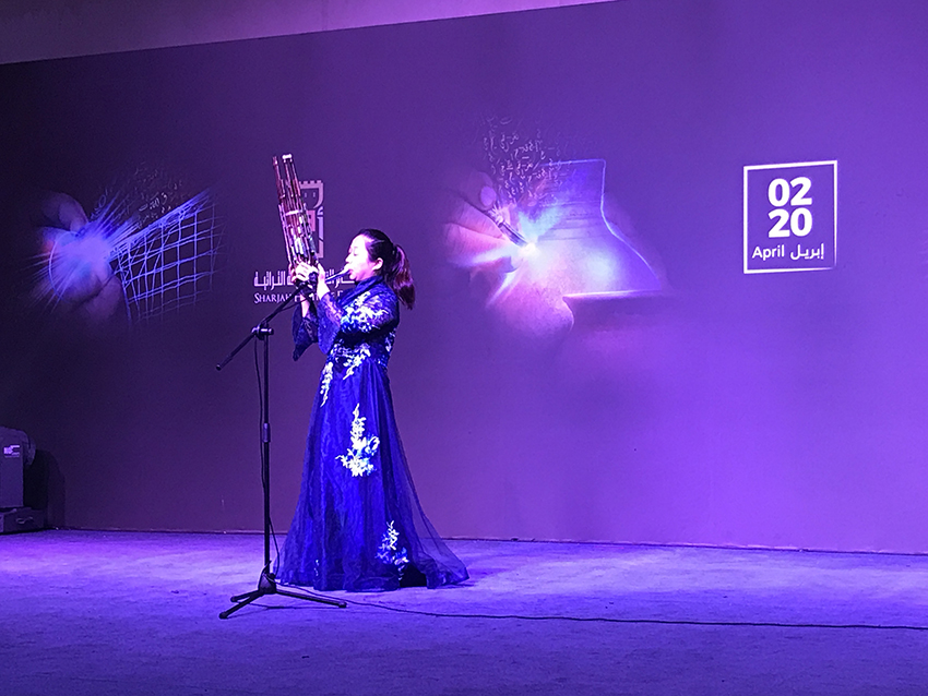 本次活动开设了中国馆,向来自世界各地的友人,展现中华文化的独特魅力,传播弘扬中国文化。中国馆不仅带去了水墨画、皮影、微雕、云锦、剪纸、刺绣等中国民间艺术,也展示了中国民族音乐的笛、笙、葫芦丝、琵琶、二胡等丝竹音乐。在开幕式上,张钰老师和几位民族乐器演奏家共同演绎了富有江南水乡特色的“茉莉花”等经典中国民间音乐,并在随后的多场展演活动中为世界各国嘉宾展示了东方音乐的魅力。中国驻阿联酋迪拜代总领事谭理女士与张群领事来到沙迦老城文化中心的开幕现场,同沙迦酋长苏尔坦.本.穆罕默德.卡西米博士以及其他各国政要名人来到了现场观看表演,并为每一位艺术家颁发了荣誉证书。