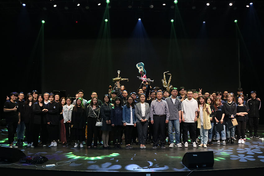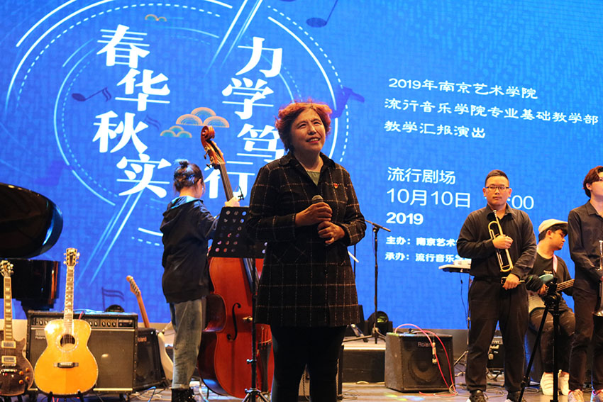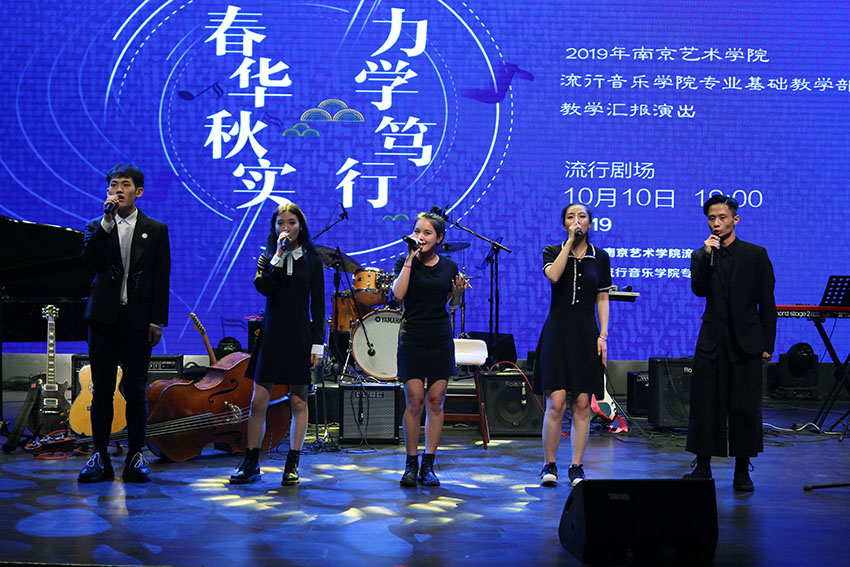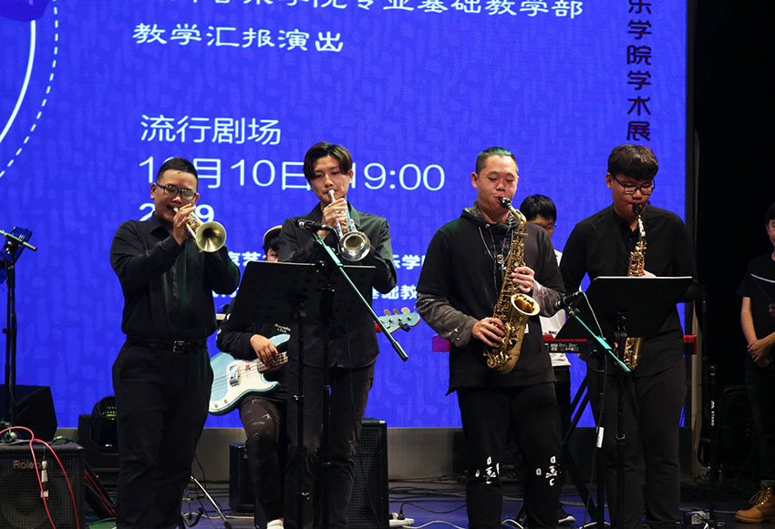 本次汇报表演分别以乐队、乐队与人声、阿卡贝拉、合唱等表演形式为大家呈现了九首风格各异的音乐作品。在短暂的乐队开场表演后,演出正式开始,演出第一个节目便是一首经典曲目《Fly Me To The Moon》的乐队与人声表演,表演者们为这首曲目做出了富有个性的创新,将圆舞曲、爵士和拉丁三种不一样的风格融合在一起,为大家带来了全新的视听感受。第一首乐曲演奏完毕后,徐欣熠老师为我们解读了本次表演主题“春华秋实 力学笃行”的含义,希望同学们勤勉学习,在实践中汲取知识。作品《S.B.D.B.Y》,是结合了陈治老师的《流行音乐多声部写作》课的内容,由任薇老师指导的作曲专业小课以及视唱练耳三门课程的一个教学实践的成果。这部作品调性频繁变化,利用多声技术丰富层次,和声上造成明暗色彩的对比,有较大的演唱难度;由杜卉老师指导的《听妈妈的话》则将这首大家耳熟能详的同名歌曲进行了改编,将四声部合唱与帕赫贝尔的《卡农》进行了混搭,既从纵向的多声部对位和横向的旋律发展上做成了一首古典+流行的混搭,给人以别样的音乐体验;郝巍老师指导并参与表演的《Her Town Too》和《Feel Like Summer》两首作品向观众传达了他关对于流行音乐风格的一些理解;钱琨老师指导的阿卡贝拉《Price Tag》以其灵活的表演方式向观众展现了较强的层次感;而由2018级全体流行音乐演唱专业演唱合唱的《A Festive Alleluia》表达了歌曲喜悦而祥和的情感氛围。最后由乐队与人声共同演绎的《Come Together》将音乐气氛推向了高潮。