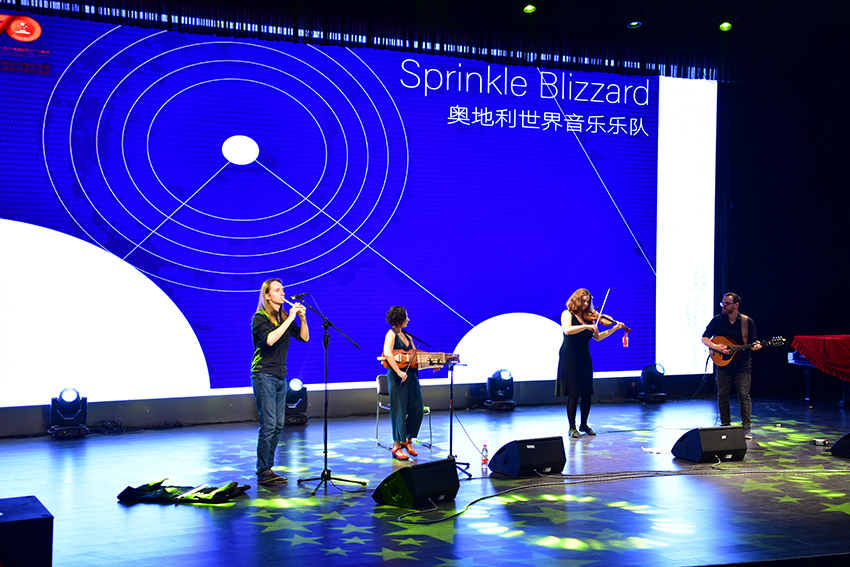 “奥地利Sprinkle Blizzard”作为一支独创组合的世界音乐乐队,以一首带有传统舞曲般旋律的原创作品——《高地(High District)》拉开了音乐会的序幕,一开场就收获在场观众雷鸣般的掌声。《华尔兹(The Waltz)》和《布雷舞曲-治愈(Bouree Cure)》所表现出的激情,带动现场全体观众跟随音乐动感的节拍拍手互动。紧接着,四位音乐家通过一首旋律悠扬的《徒步旅行者(Wayfarer)》引领观众从热闹与繁华步入独自旅行的安逸。此后,《来自丹尼尔(From Daniel)》、《波兰俚语(Slang Polska)》、《法式面包士兵(Baguette Soldier)》三首乐曲通过音乐家乐器之间的交流和肢体的律动丰富变化,时而激情澎湃,时而温馨浪漫,展现出音乐所拥有的强烈的、深刻流动的吸引力,感染着现场全体观众。最后,“奥地利Sprinkle Blizzard世界音乐乐队”为现场观众奉献了改编自中国传统乐曲《杨柳青》的音乐作品——《Chinese》,四位音乐家在中国传统音乐中融入了瑞典和爱尔兰音乐风格元素,中西合璧的奇妙效果将音乐会气氛推向高潮,为此次活动划上了圆满的句号。