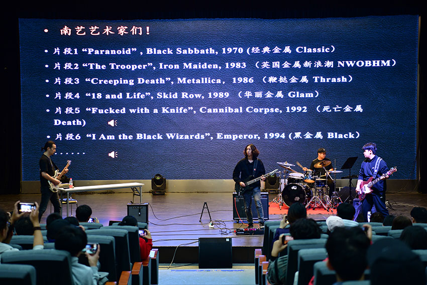 王老师的讲座分为三个板块:一是金属音乐的起源与历史、重金属的概念与审美追求;二是有关重金属研究的学术交流和研究方向;三是有关中国的重金属音乐。期间,王老师还与流院师生合作表演了部分音乐片段,概括了金属乐从诞生到金属乐慢慢没落。