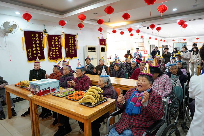 志愿者们为老人们精心准备了多个适合他们欣赏的节目,如歌曲《映山红》、《我和我的祖国》、《歌唱祖国》,故事演说《牡丹亭》等,这些节目瞬间唤起了老人们年轻时的记忆,一首首爱国歌曲激起老人们内心洋溢的家国情怀。活动当天恰逢几位老人的生日,员工会志愿者们提前为老人们准备了生日蛋糕,并齐声为老人们唱响生日快乐歌,老人们脸上布满了笑容,透着幸福与喜悦的红晕。