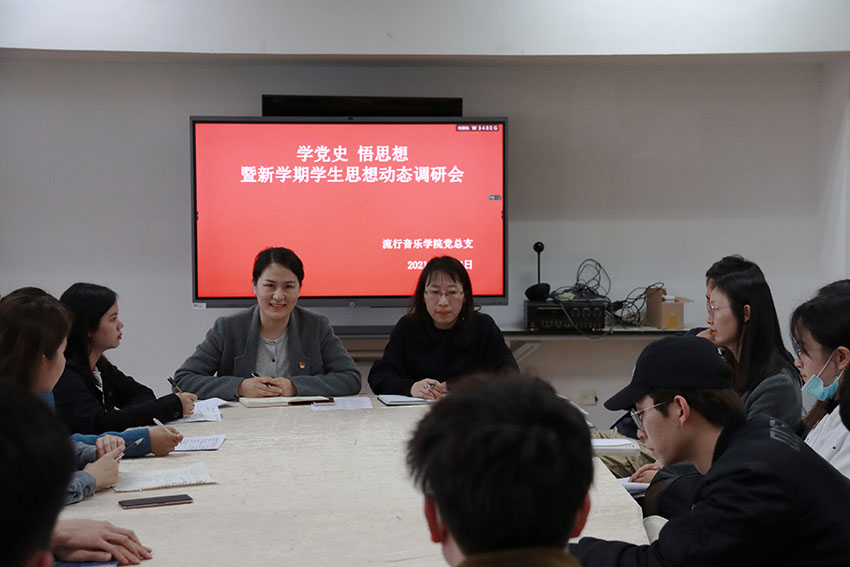 3月24日下午,必一运动bsport体育在演艺大楼六楼会议室召开了“学党史 悟思想”暨新学期思想动态调研会。本次调研会旨在为广泛动员同学们积极“学党史”、“悟思想”,及时掌握公司员工新学期思想动态,了解员工假期及返校后的学习、生活、疫情防控等情况,帮助员工解决学习、生活中遇到的困难和问题,力求有的放矢“办实事”,齐心协力“开新局”。流行音乐公司党总支副书记于翊平,学工办全体辅导员以及25名本、硕员工代表参加了会议。会议由学工办主任王书玲主持。