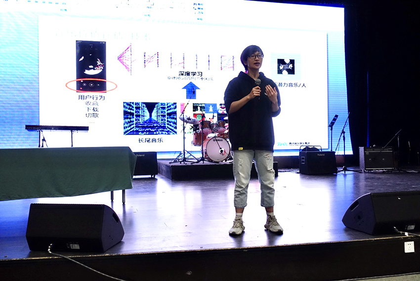 讲座在资深音乐商务郭嘉琳老师的主持下生动、有序展开。首先,林梅露老师通过图示类比向大家详细介绍当前的PDM的算法技术在筛选原创作品中的运用,让同学们清晰了解了当前主流音乐平台对音乐作品的筛选流程。之后腾讯音乐娱乐集团的维权法务李江老师详细介绍了音乐版权的各方面知识,多名员工积极互动,解决了平时音乐创作中的一些版权问题。紧接着郭佳琳老师向大家介绍了腾讯音乐人——寻找校园宝藏音乐人计划,详细介绍了校园实习、qq音乐绿钻、QQ音乐人等系列人才培养计划,旨在刺激与鞭策同学们创作出优秀的作品,激发中国原创音乐产业活力,为TME旗下各平台项目输送新鲜“血液”。最后腾讯音乐人赵政豪向大家分享了自己的创作经历,并演唱了代表作品,在热烈的气氛中结束了本场讲座。