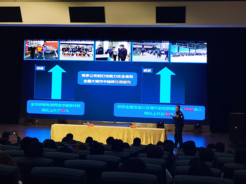 南京市公安局刑侦局八大队大队长、江苏省刑侦专家、公安部反诈专家、工信部专家吴强警官为同学们带来了“深化高校反诈宣传共同守护校园平安”的专题讲座。讲座主要围绕“当前电信诈骗案件的严峻形势”、“加强反诈宣传的重要作用”、“涉及高校的电诈犯罪主要类型及特点”、“高校反诈宣传工作如何开展”、“反诈宣传工作的拓展延伸”等五个部分展开。讲座中吴警官结合真实案例,并辅助以形象的微视频,从南京总体治安形势入手,阐明了当前电信诈骗的严峻形势,为老员工科普了冒充电商物流客服类、刷单返利类、游戏网络产品虚假交易类、虚假贷款类及裸聊诈骗类等涉及高校电诈犯罪的运作机制,并分类列举了十余种校园电诈事例,形象地向同学们展示了高科技犯罪对老员工的身心危害。针对诈骗手段翻新变化快、电信行业监管漏洞、打击处理难度大及电信诈骗的突出特点,吴警官介绍了目前警方在全社会开展防范电信网络诈骗的宣传教育、大力推进精准预警劝防、加强96110反诈专线和国家反诈中心的建设应用等重要措施。讲座最后,吴警官再次强调提醒同学们一定要做到不裸聊、不刷单、不要随意贷款、不随意进行风险投资,在遇到电信网络诈骗时一定要学会反诈骗的灵魂8问。吴警官指出电信网络诈骗是可防性犯罪,只要坚持打防并举、以防为先,综合采取人防、技防、宣防等措施,构建严密的防范管控体系,一定可以把案件高发的势头压下来;与此同时,随着群防群治工作的加强、全民反诈格局的建立及社会治理能力的提升,我们一定可以打赢这场反电信网络诈骗的“人民战争”。
