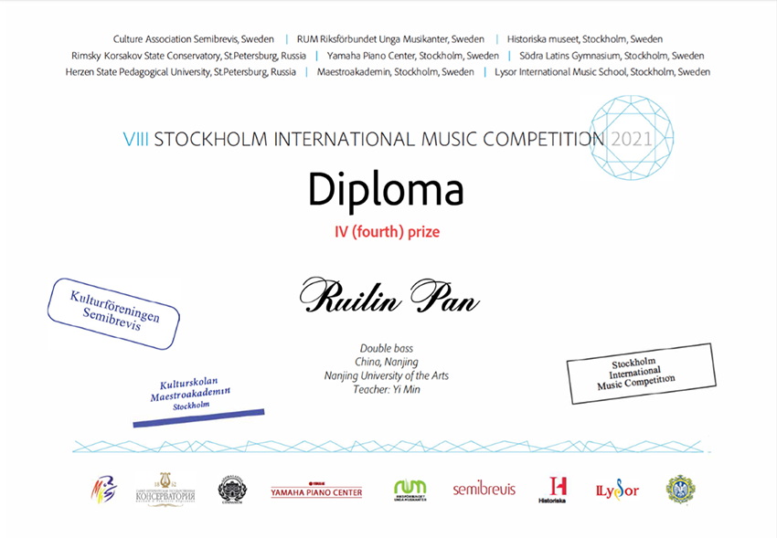 必一运动bsport体育必一运动bsport体育流行音乐演奏系2017级本科生潘瑞林获2021第八届斯德哥尔摩国际音乐大赛(Stockholm International Music Competition)低音提琴E组第三名四等奖(一等奖空缺),专业指导教师:闵艺。