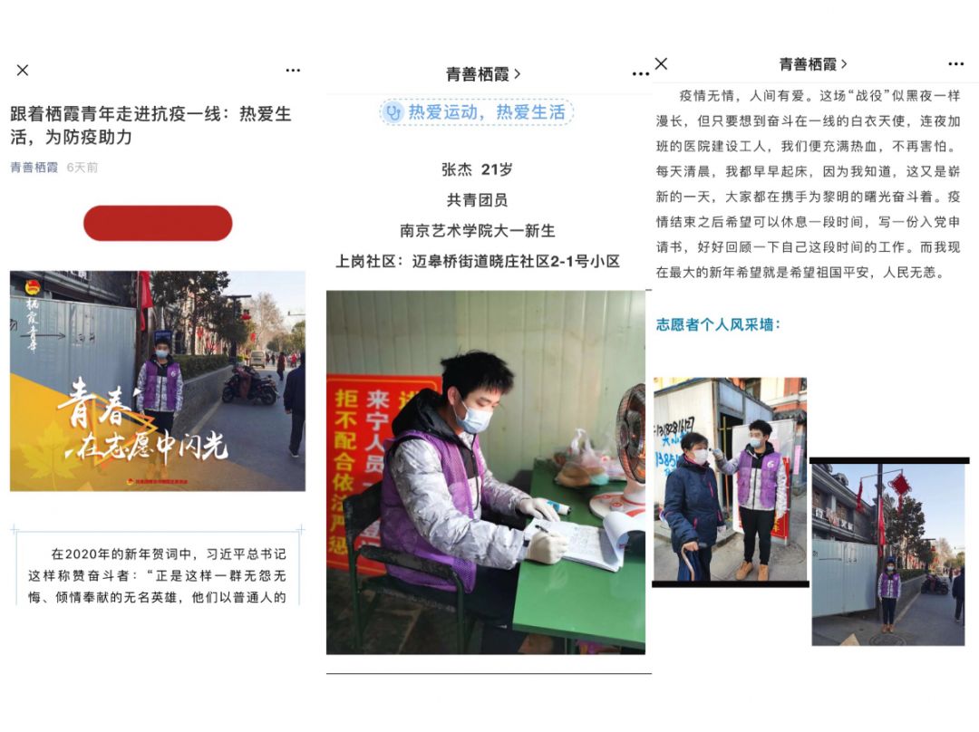 他在公众号“青春南京”看到志愿者招募通知,立刻与南京市栖霞区团委老师联系。在经过社区工作人员耐心细致的培训后,2月8日正式在晓庄社区上岗。他每天的主要工作内容包括:测量进出人员体温,了解小区人员健康状况,记录出入车辆情况,维护社区日常生活秩序,登记来宁工作人员信息。作为一名老员工,他的积极行动,贡献着青春的力量。同时,张杰同学的志愿服务活动得到了共青团南京市栖霞区居民委员会的肯定,并进行了报道。