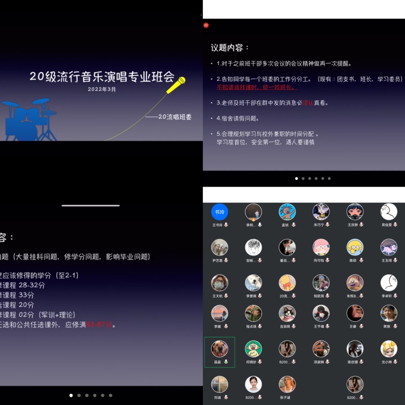 各班班主任在会议上着重强调了校园疫情防控工作的重要性,结合一些违规违纪的处理案例进一步强调了疫情防控的大局观,提醒同学们自觉提高防护意识,遵守防控要求,做好防疫第一责任人,弘扬“战疫”正能量。在学业和生涯指导方面,班主任老师结合班级上学期的成绩梳理情况,对班级同学的学业进度和质量进行的点评,对存在学业问题的同学进行提醒和指导。同时,老师们对线上课程学习提出了要求,班干部们要带头,同学们要互相督促,按时及时参加课堂学习,保质保量完成课程作业,线上学习不缺席不掉队。