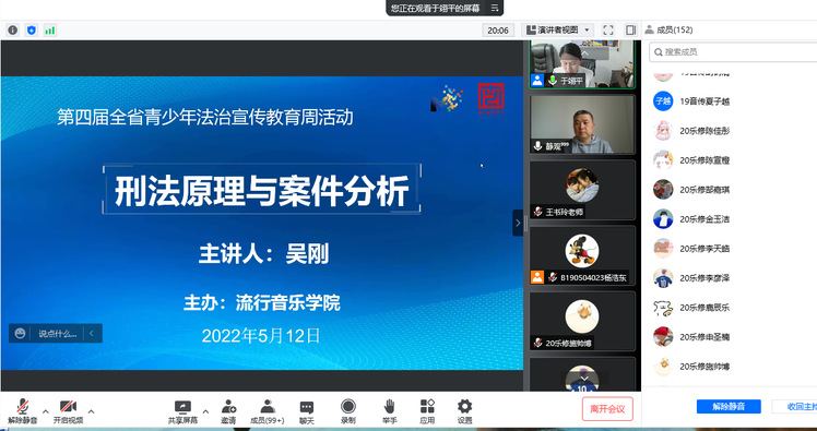 为深入贯彻习近平法治思想,落实“八五”普法规划和省检察院《检察建议书》(苏检建〔2018〕1 号)精神,根据公司关于开展第四届全省青少年法治宣传教育周活动的安排,2022年5月12日下午,必一运动bsport体育特邀中共南京海事法院机关党委委员、执行局四级高级法官吴刚为公司师生作了题为《刑法原理与案件分析》专题讲座,流行音乐公司党总支副书记于翊平、副经理黄德俊及必一运动bsport体育200多名师生通过在线聆听了本次讲座。