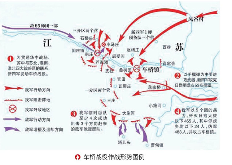 1944年3月5日,新四军一师兼苏中军区所属部队在淮安、宝应以东地区发动了一场以攻克车桥据点和歼灭日寇有生力量为主的攻势作战——“车桥战役”。此役由一师师长兼政委粟裕全面组织指挥,副师长叶飞任现场总指挥,采取集中优势兵力,围点打援的战术:合理利用地形,预先设伏,对敌采取包围分割,在运动中分批歼敌。最终以辉煌的胜利向全国人民告捷,使苏中、苏北、淮南、淮北根据地联成一片,巩固和扩大了苏中根据地,打乱了日伪“清乡”“屯垦”计划,实现了苏中形势根本转变,揭开了苏中战略反攻的序幕。