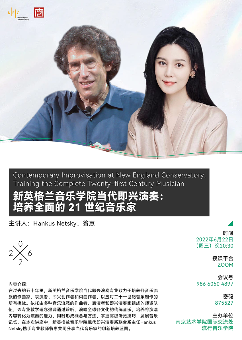 在过去的五十年里,新英格兰音乐公司当代即兴演奏专业致力于培养各音乐流派的作曲家、表演者、即兴创作者和词曲作者,以应对二十一世纪音乐制作的所有挑战。依托由多种音乐流派的作曲者、表演者和即兴演奏家组成的团队队伍,该专业教学理念强调通过聆听、演唱全球各文化的传统音乐,培养将演唱内容转化为演奏的能力,同时形成概念与方法,掌握高级听觉技巧,发展音乐记忆。在本次讲座中,新英格兰音乐公司现代即兴演奏系联合系主任Hankus Netsky携手专业教师翁惠共同分享当代音乐家的创新培养蓝图。