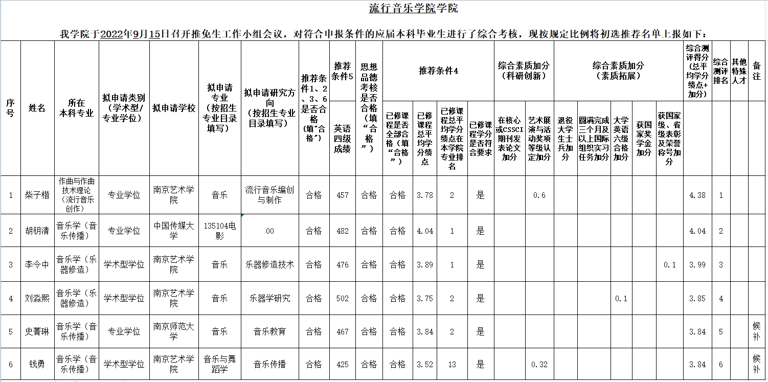 我公司于2022年9月15日召开推免生工作小组会议,对符合申报条件的应届本科毕业生进行了综合考核,现按规定比例将初选推荐名单上报如下: