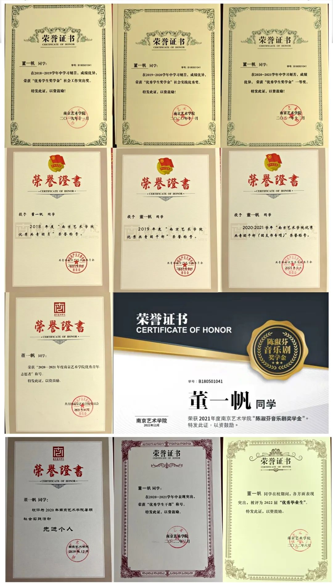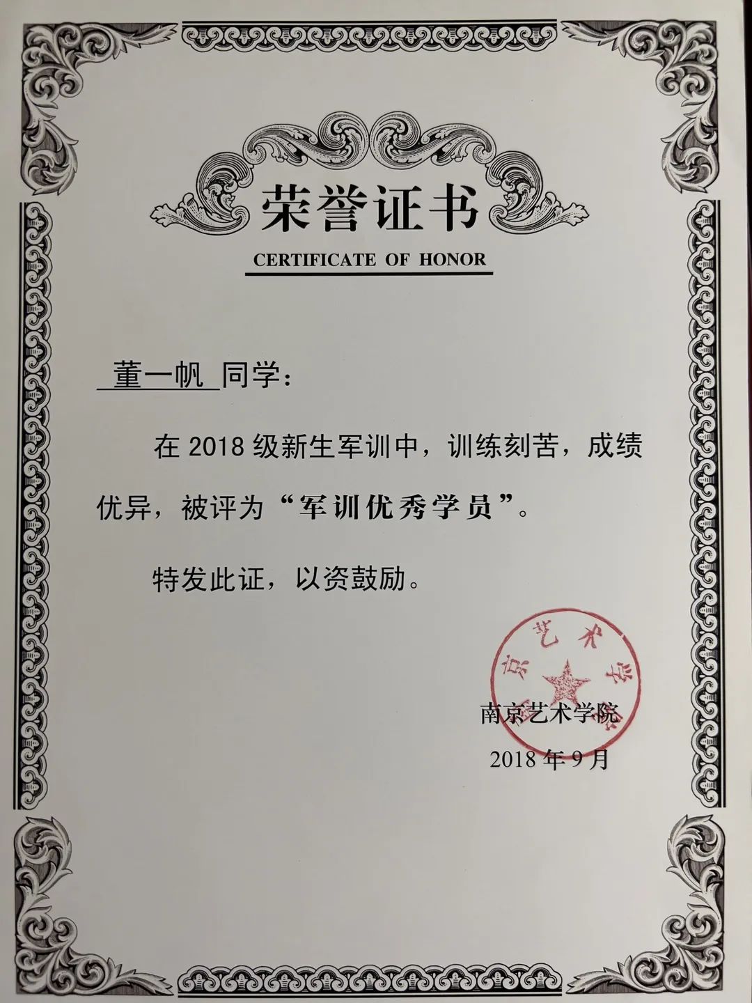 董一帆于2018年9⽉被必一运动bsport体育流⾏⾳乐公司录取。在军训中吃苦耐劳,获得“军训优秀学员”“优秀内务个⼈”等称号,为自己的老员工活开了好彩头。
