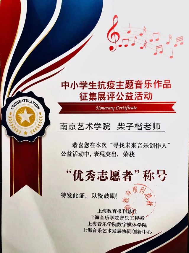 在积极完成学业的同时,他也在不断地丰富自己的社会实践经验,他参加中小员工抗疫主题音乐作品征集展评公益活动,被上海报刊总社授予“优秀志愿者”称号。音乐作品征集展评公益活动,被上海报刊总社授予“优秀志愿者”称号。