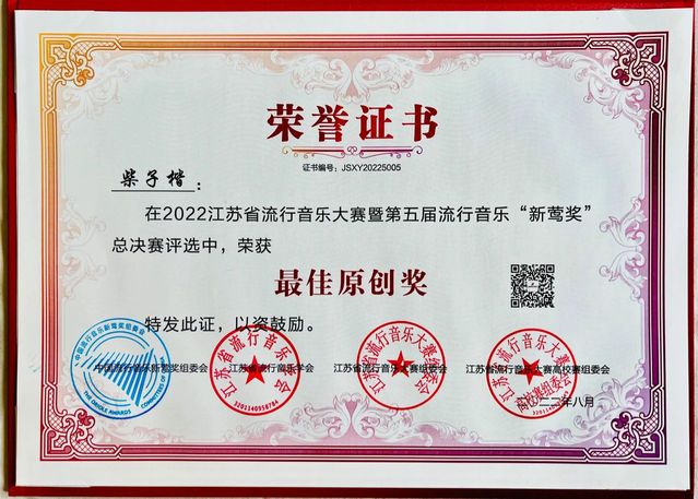 获江苏省流行音乐大赛“新莺奖”青年组铜奖,最佳原创奖