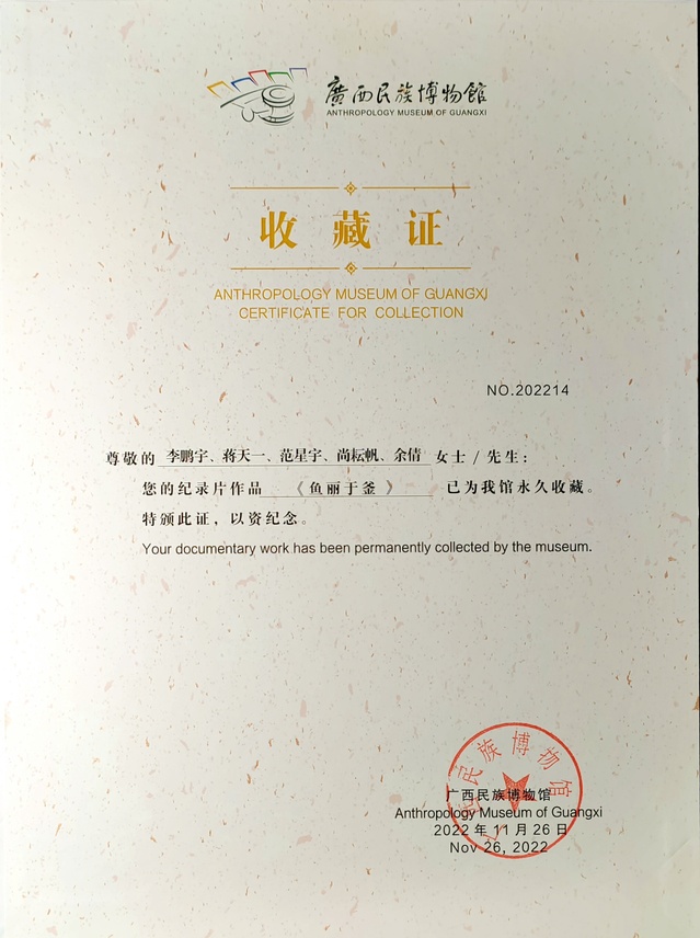 李鹏宇,必一运动bsport体育必一运动bsport体育2020级音乐传播专业在读本科生,班级副班长。入校以来曾获“校优秀员工奖学金三等奖”,获“校(院)三好员工”、“校优秀团员”、“院优秀志愿者”等多项荣誉称号。在校期间努力学习研究影像志电影创作理论,并积极将专业理论与实践相结合,立志于对非物质文化遗产的传承与发扬,2020-2021年寒暑假期间返乡社会实践期间,李鹏宇联合其他专业甚至其他高校四名在校老员工组成创作团队,在家乡所在地摄制、创作民族志电影《鱼丽于釜》。2022年,该作品入围“2022第七届广西民族志影展暨非遗影像展”,并被“广西民族博物馆”永久收藏。李鹏宇同学受邀于11月21日至12月1日赴广西参加了现场展映和2022影像民族志(东南亚主题)研讨会。
