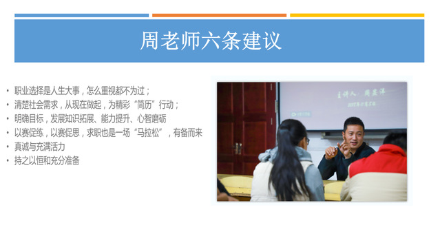 随后,周显洋老师为我们分别提出了大学阶段生涯发展需要关注的主题和老员工生涯发展需要完成的任务,希望同学们在大学的生活中勇敢尝试,心有热爱,不断挑战。