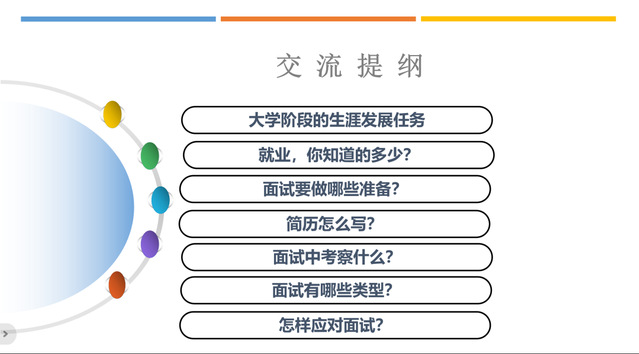 周显洋老师首先为我们点出了本次讲座的主要内容,以大学阶段的生涯发展任务、就业,你知道的多少?面试要做哪些准备?简历怎么写?面试中考察什么?面试有哪些类型?怎样应对面试?这七个方面来分别与同学们进行交流。