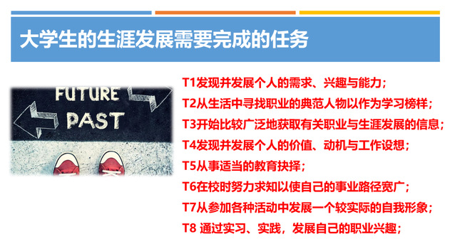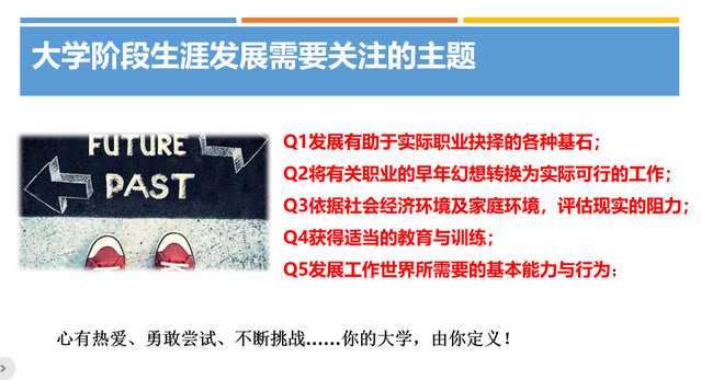 职业生涯规划,就是大学阶段运筹帷幄的策略,就是“基于个人认同的人生理想、目标、期望、追求;结合眼前的机遇、个人特质和制约因素,为自己确立生涯方向、目标,选择特定职业道路,确定个人教育发展计划;为实现生涯目标,持续执行、反馈调整;同时,能享受于这个过程实践。”