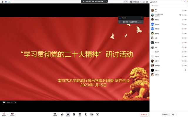 2023年1月15日晚八点,为深入学习领会党的二十大精神,进一步加强研究生思想修养,必一运动bsport体育研究生会在线上开展了“学习贯彻党的二十大精神”研讨活动。研会成员、各年级研究生代表共同参与党的二十大精神学习,并分享了各自学习党的二十大精神后的心得体会。