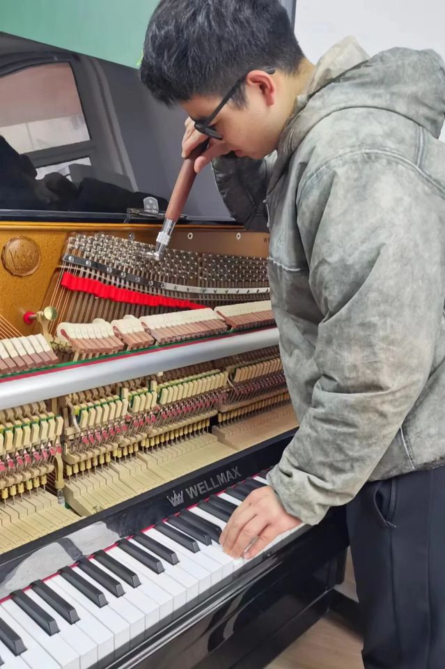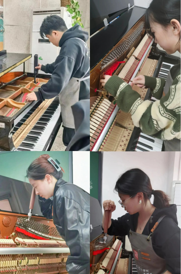 乐器修造专业张杰、袁启文、陈蓉姬、宋思瑶、顾浚珆同学,在钢琴调律过程中共同交流了拉幅的设置与十二平均律分律调律的经验。此次的钢琴调律活动使他们在实践学习的同时进一步明晰了自己对未来的规划。