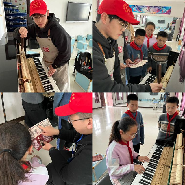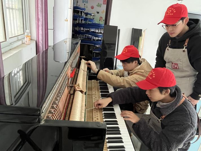 在音乐素质拓展课结束后,团队中乐器修造专业的鹿辰乐、施帅博、李彦泽三位同学开始对金南小学的钢琴进行专业的调律与维护。