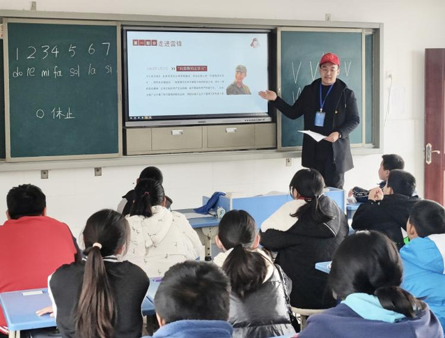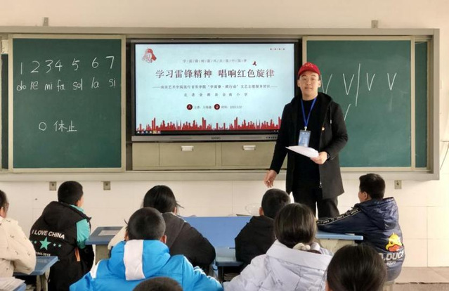 团队抵达后,首先由流行音乐创作专业的王海鑫同学给金南小学的孩子们带来了主题为“学习雷锋精神 唱响红色旋律”音乐素质拓展课。