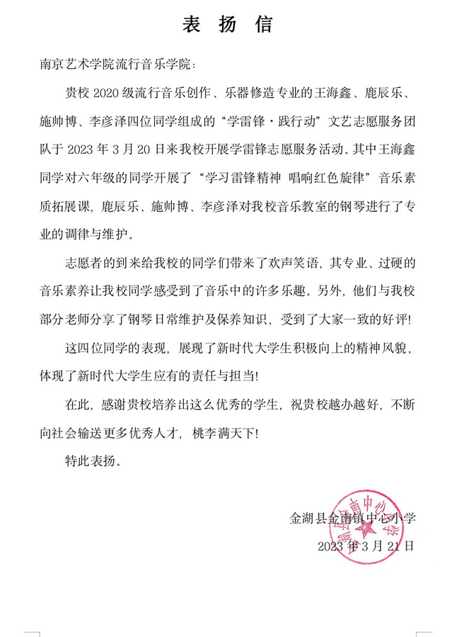 “学雷锋·践行动”文艺志愿服务团队在本次志愿服务活动中表现突出,受到了金南小学的感谢和高度赞扬。