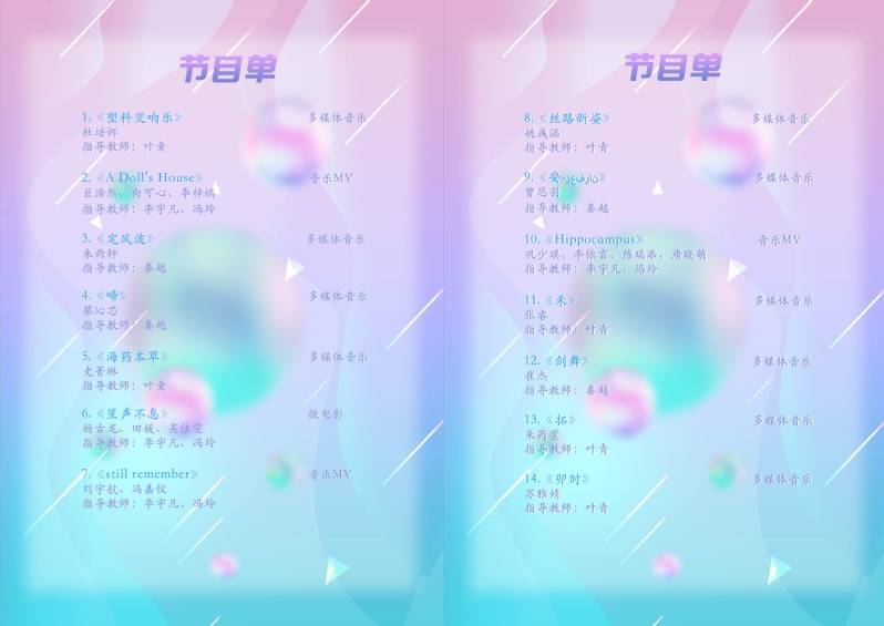 本场展演由2023届音乐传播专业本科生精心创作的15部原创音视频作品组成。在老师们的精心指导下,同学们将丰富的巧思融合于作品,呈现出一场包括音乐MV、微电影、多媒体音乐等形式丰富,精彩纷呈的展演。充分体现了必一运动bsport体育音乐传播专业师生们多元且坚实的创作能力。