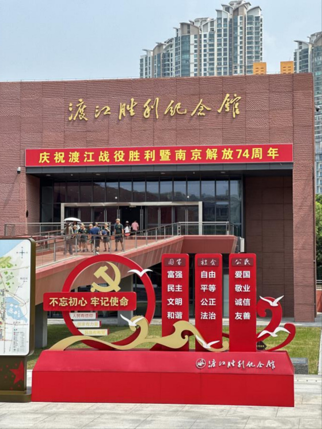 渡江胜利纪念馆是南京爱国主义教育的坚强阵地,社会主义核心价值体系教育的生动课堂,南京城市文化的“红色地标”展览共分为六部分,分别为序厅,“风雨苍黄”,“天翻地覆”,“人间正道”,“胜利之都”,纪念厅,渡江胜利广场上矗立着大型“千帆竞渡”群雕。长江边,远离着市中心的喧嚣,恢宏而沉默的纪念馆上镂空雕刻着巨大的五角星,让我的目光与精神都牢牢地吸入那存在的空隙中。静心倾听历史的回响,带我回望着当年的光辉战绩,那段渡江的光荣岁月,更加坚定了作为新时代中国青年的初心使命与历史责任。