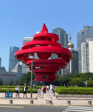 五四广场是青岛最具代表性的地标建筑之一,“五月的风”为五四广场主题钢雕塑,以单纯简练的造型元素排列组合成旋转腾空的“风”,顶部装置有火炬头,通体火红,寓意青岛与五四运动的渊源,五四运动是点燃新民主主义革命的“火种”。五四广场布局展现出庄重、坚实、蓬勃向上的景色,通过大面积风景林衬托出充满生机和现代气息的画面;主题雕塑“五月的风”昭示着永不低头、捍卫主权的坚定信念以及反帝反封建的爱国主义基调和张扬腾升的民族力量,它号召新时代新青年要像一阵向上刮起的旋风一样,生生不息、奋发向上。