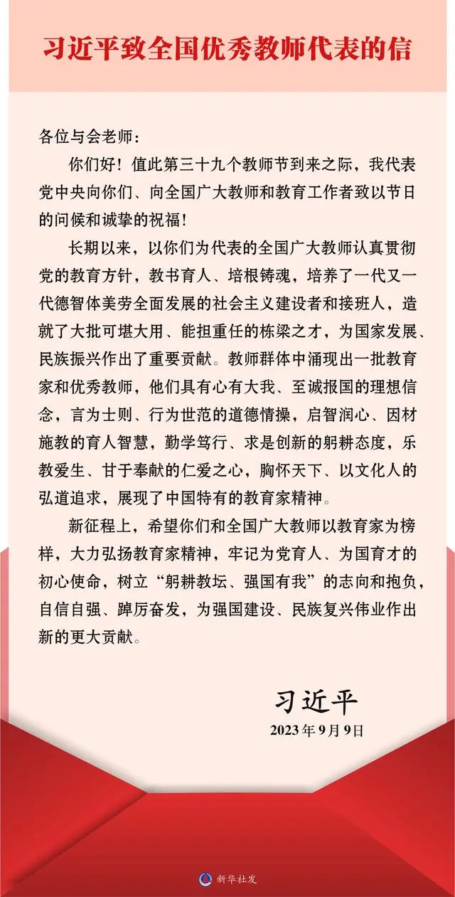9月9日,全国优秀教师代表座谈会在北京召开。习近平总书记致信与会教师代表,在第三十九个教师节到来之际,代表党中央,向他们和全国广大教师及教育工作者致以节日的问候和诚挚的祝福。