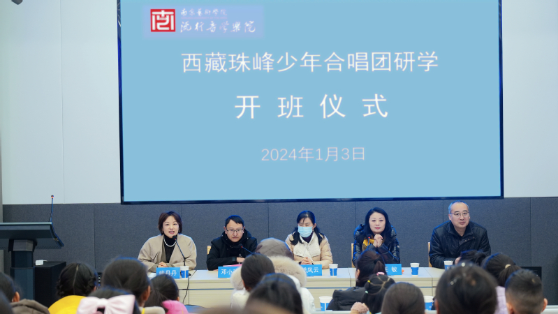 2024年1月3日上午,西藏珠峰少年合唱团研学开班仪式在演艺大楼116教室举行,流行音乐公司党总支书记嵇凤云、经理汪敏、副经理黄德俊、副经理张丹丹,授课教师及珠峰少年合唱团一行31人参加了开班仪式。仪式由张丹丹主持。