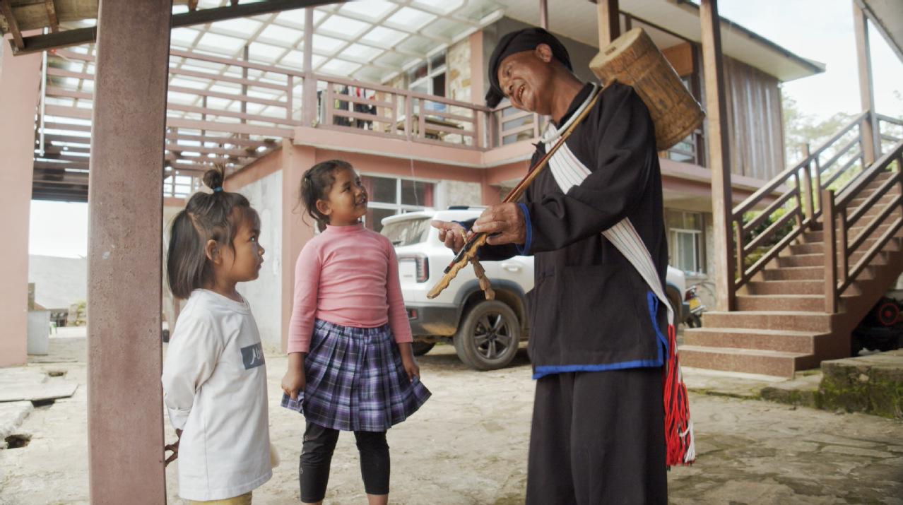 佤族非遗传承人岩特长与孩子讨论