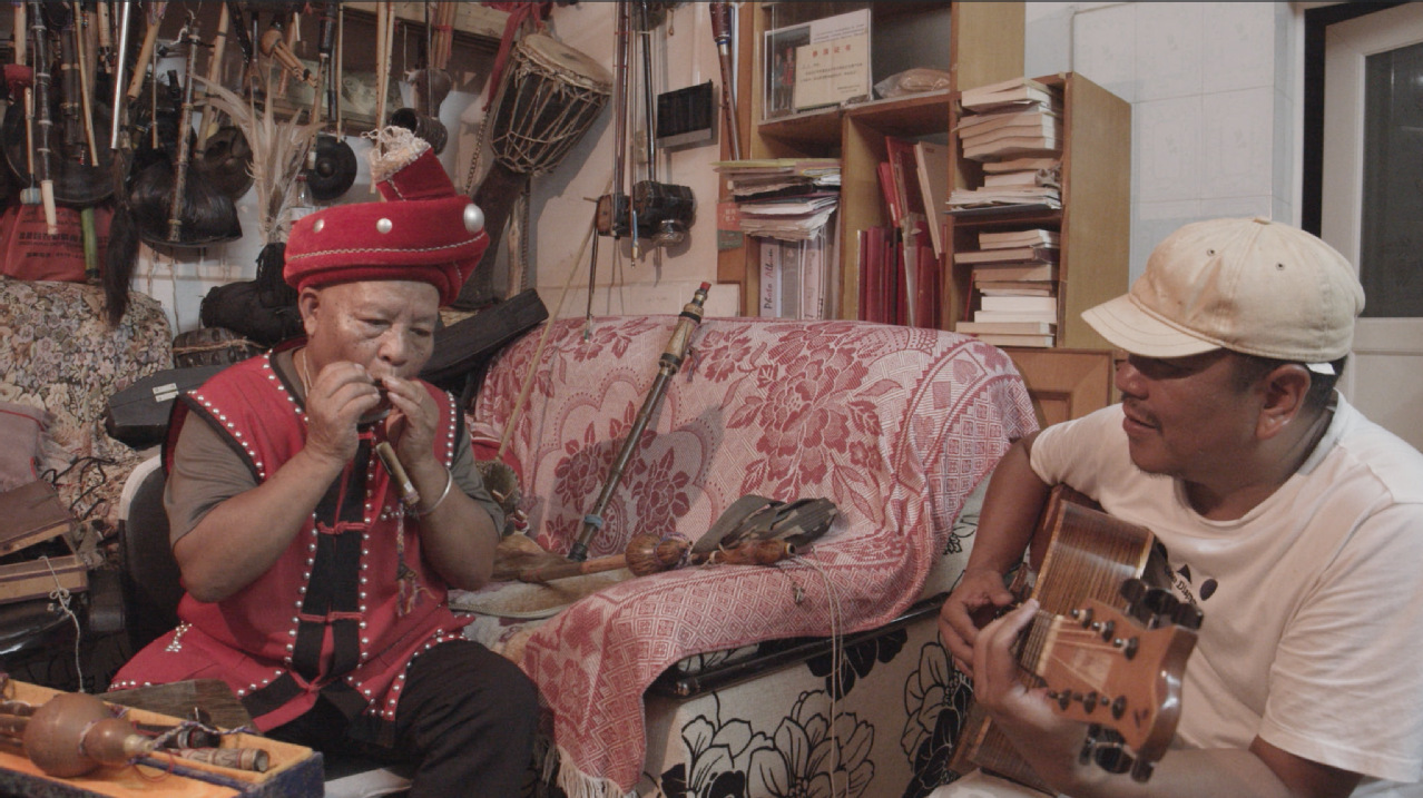 后来,随着田野调查和主题的深入,我选择了司岗里乐队的队长老由(汤仲尉)作为影片的主要角色。影片更像是档案片的形式,借用老由的视角,对云南流行音乐史进行了基本的梳理。现在的佤族人们,已经形成规模性的艺人群体,他们以音乐和民间艺术的现代展演作为他们的生计方式。在云南流行音乐蓬勃发展的今天,我们不应忘记“寻根”的过程,因为唯有不断地“寻根”,从多元民族文化而来的流行音乐才能有底气、立得住。因此,我们不应忘记,流行音乐的蓬勃发展是以老由为代表的早期接触流行音乐的那批本土人的音乐往事作为先导的。