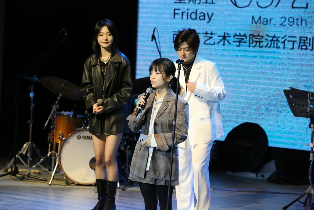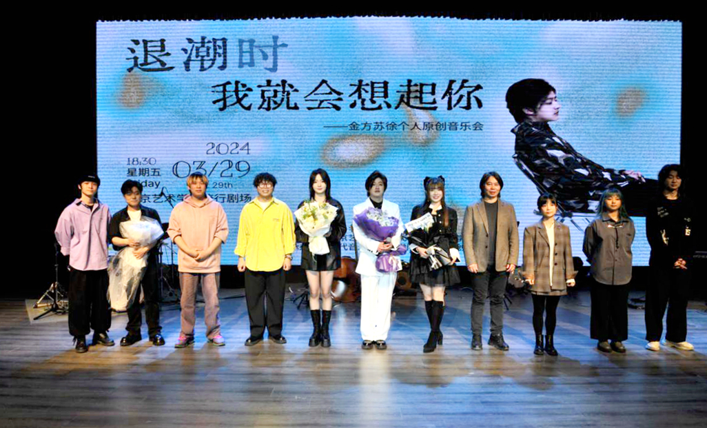 金方苏徐是流行音乐创作专业 2020 级本科生,自幼学习音乐,入校后师从杜卉老师,在她的指导下在本科期间学习并掌握了多种音乐风格。这场音乐会的原创作品中融合了爵士、拉丁以及R&B等多种元素,音乐会节目以独唱、对唱、合唱、唱跳以及乐队演奏等多种表演形式呈现,节目内容丰富多样,在场观众掌声与赞赏不断。