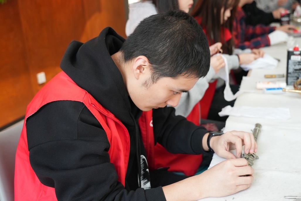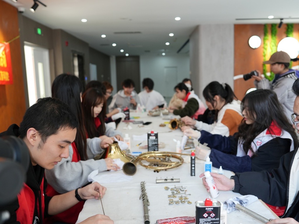 下午,由管乐修造员工为社区居民志愿进行现场管乐器维护和保养。一件件斑驳且黯淡无光的乐器在历经同学们耐心的清洗、抛光、粘合、组装等修复处理后变得焕然一新,完好如初,件件乐器仿佛有了新的生命,焕发出原本的音色。