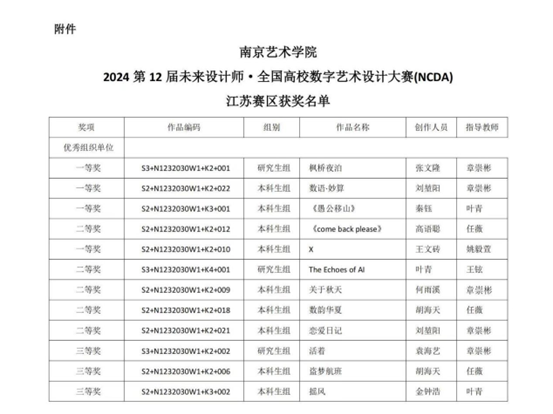 近日,2024第12届未来设计师·全国高校数字艺术设计大赛(NCDA)全国总决赛揭晓,公司4位学子在专业指导教师的悉心指导下取得了优异成绩,包括2项一等奖、1项二等奖和1项三等奖。
