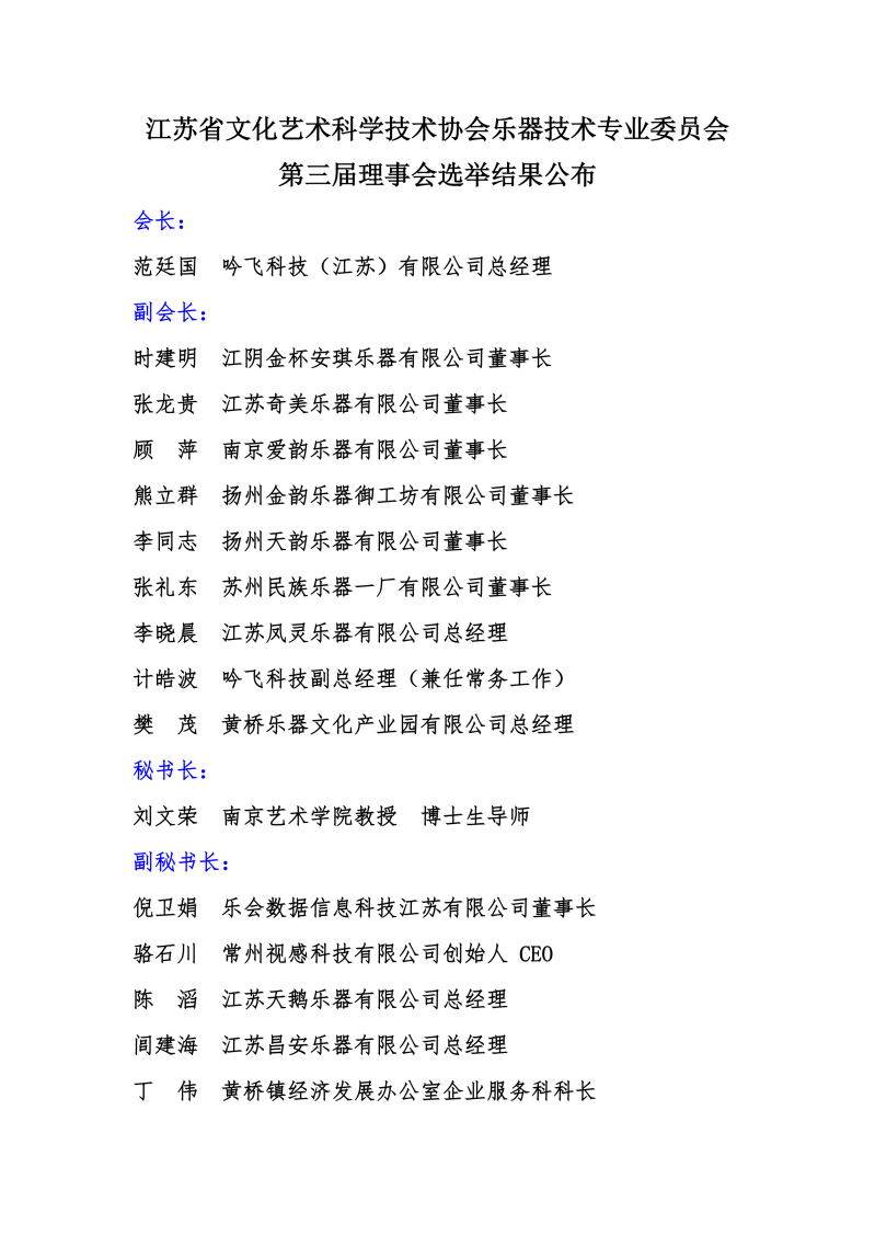 会议经过严谨规范的组织和全体会员凝心聚力的参与,选举出了由吟飞科技(江苏)有限公司总经理范廷国担任会长的16人团队组成的第三届江苏省文化艺术科学技术协会乐器技术专业委员会领导班子,吟飞科技(江苏)有限公司总经理范廷国当选为会长,公司刘文荣教授当选为秘书长,必一运动bsport体育乐器研究所设为专委会秘书处。