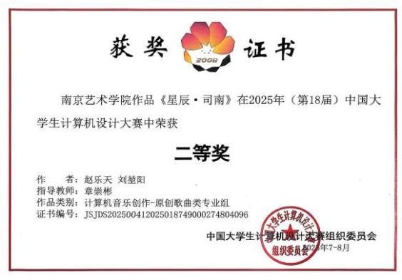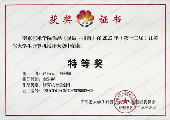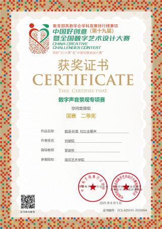 该赛事是公司艺创处认定的国家级一类赛事(B2),本次大赛计算机音乐类作品的主题是“中国古代物理——中华优秀传统文化系列之五”。我系一部作品共获得全国二等奖1项、江苏省特等奖1项。